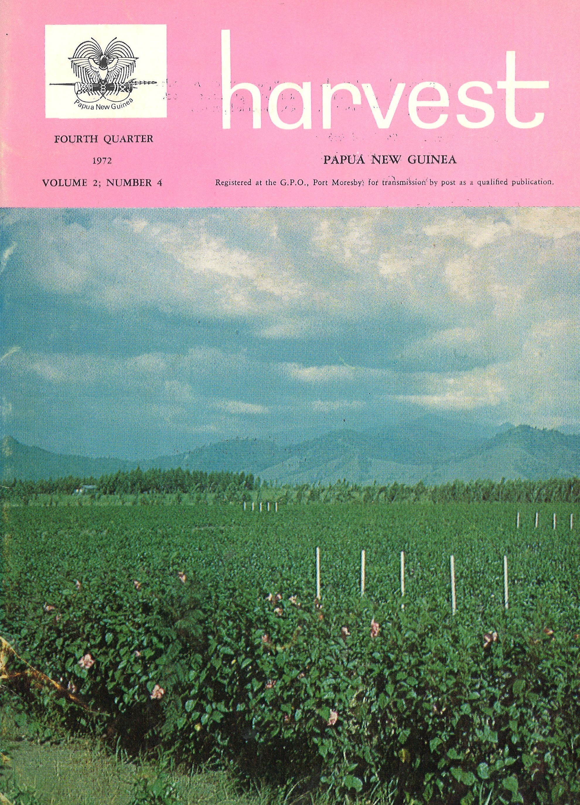 Vol. 2 No. 4 (1972)Harvest is published quarterly by the Department of Agriculture, Stock and Fisheries under the authority of the Minister of Agriculture, Stock and Fisheries. It is distributed free to primary producers and other qualified persons.