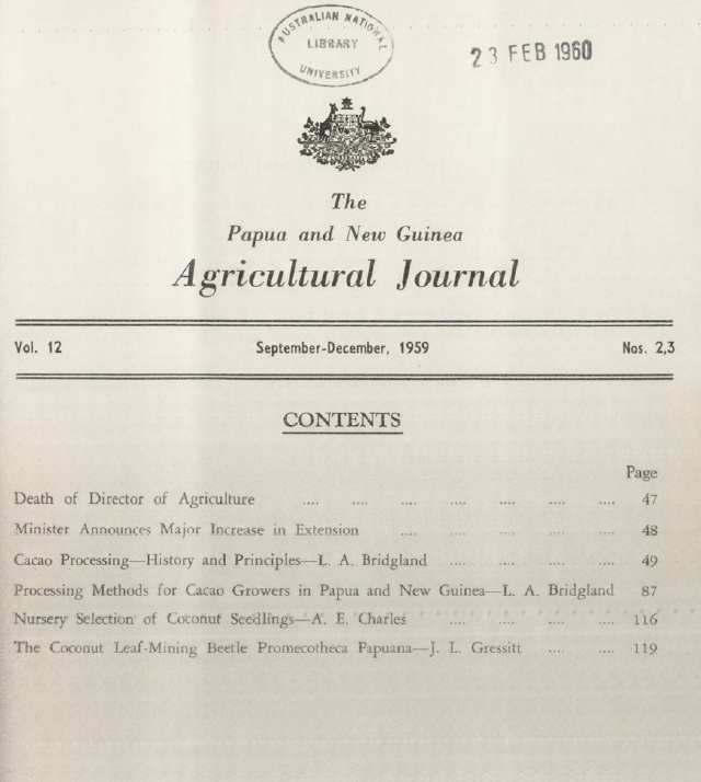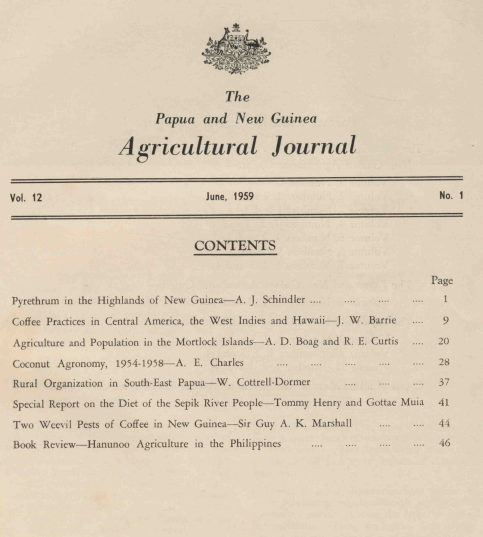 Vol. 12 No. 2-3 (1959)The Papua and New Guinea Agricultural Journal deals with recent advancement of tropical agriculture and acts as an extension medium for the dissemination of agricultural information to the Territory planting and farming community.