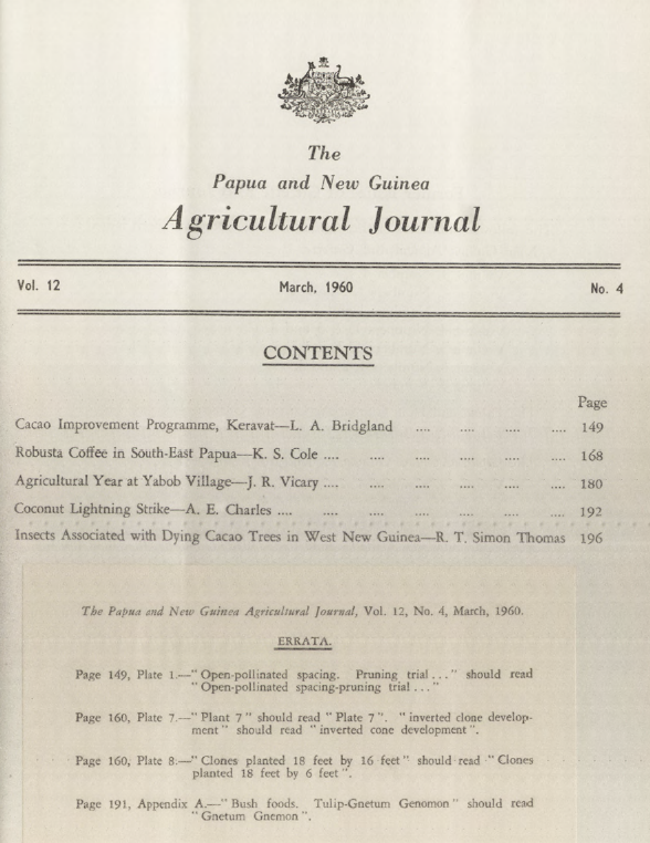Vol. 12 No. 4 (1960)The Papua and New Guinea Agricultural Journal deals with recent advancement of tropical agriculture and acts as an extension medium for the dissemination of agricultural information to the Territory planting and farming community.