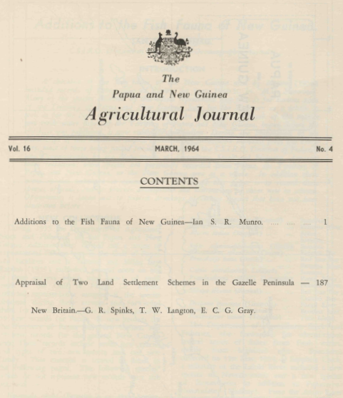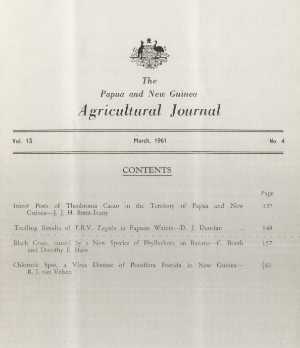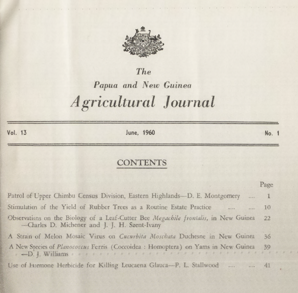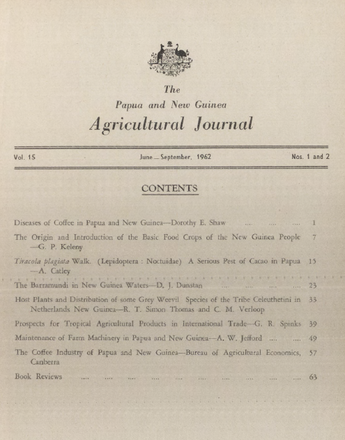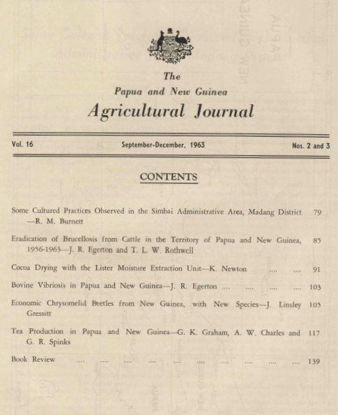 Vol. 16 No. 2-3 (1963)The Papua and New Guinea Agricultural Journal deals with recent advancement of tropical agriculture and acts as an extension medium for the dissemination of agricultural information to the Territory planting and farming community.