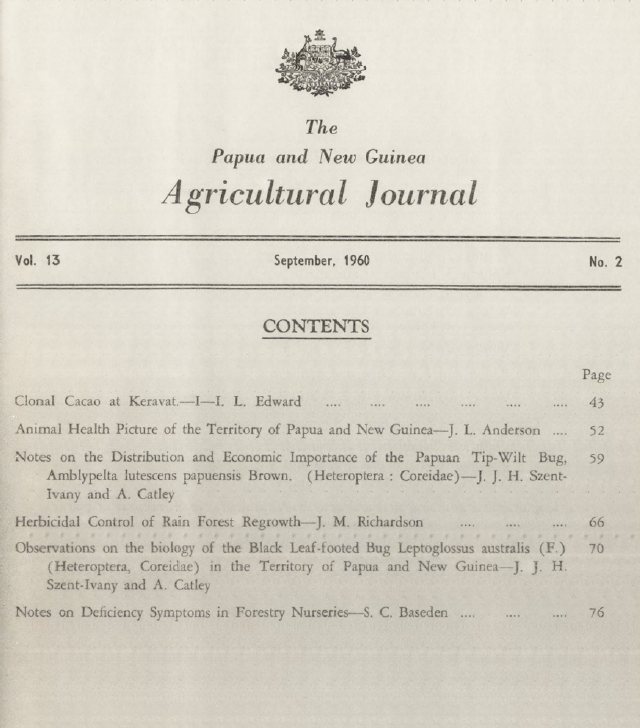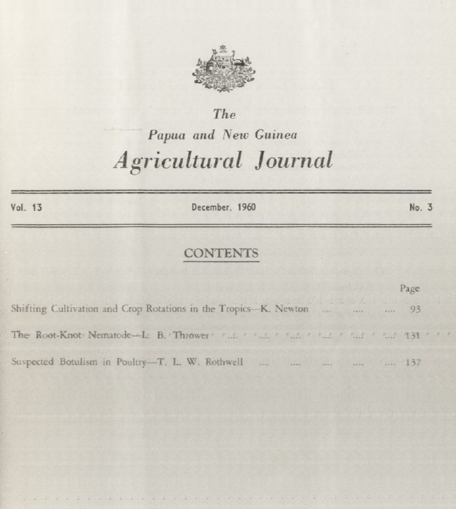 Vol. 13 No. 2 (1960)The Papua and New Guinea Agricultural Journal deals with recent advancement of tropical agriculture and acts as an extension medium for the dissemination of agricultural information to the Territory planting and farming community.
