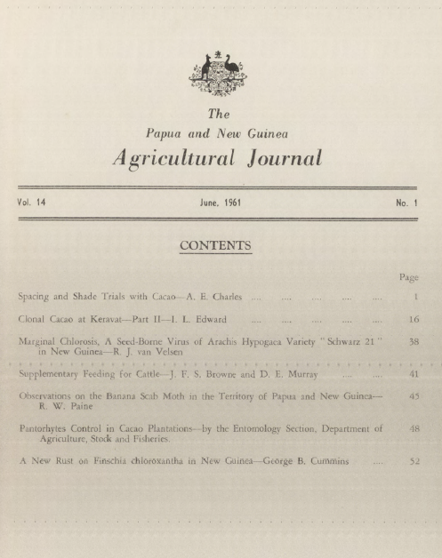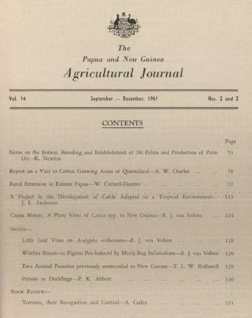 Vol. 14 No. 2-3 (1961)The Papua and New Guinea Agricultural Journal deals with recent advancement of tropical agriculture and acts as an extension medium for the dissemination of agricultural information to the Territory planting and farming community.