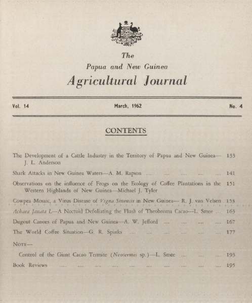 Vol. 14 No. 4 (1962)The Papua and New Guinea Agricultural Journal deals with recent advancement of tropical agriculture and acts as an extension medium for the dissemination of agricultural information to the Territory planting and farming community.