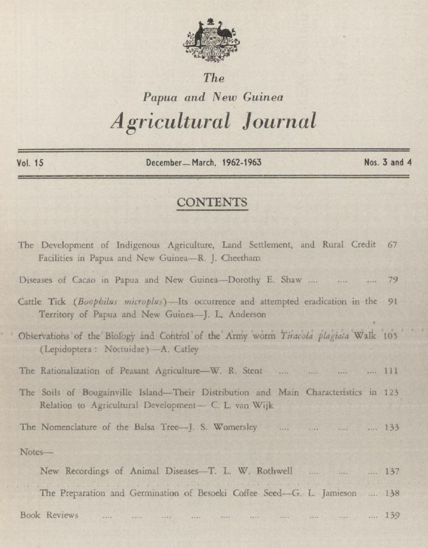 Vol. 15 No. 3-4 (1963)The Papua and New Guinea Agricultural Journal deals with recent advancement of tropical agriculture and acts as an extension medium for the dissemination of agricultural information to the Territory planting and farming community.