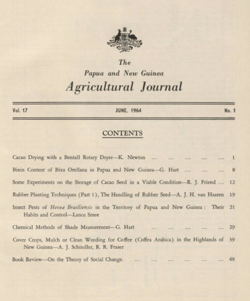 Vol. 17 No. 1 (1964)The Papua and New Guinea Agricultural Journal deals with recent advancement of tropical agriculture and acts as an extension medium for the dissemination of agricultural information to the Territory planting and farming community.