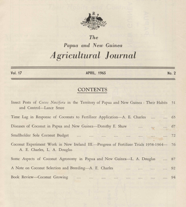 Vol. 17 No. 2 (1965)The Papua and New Guinea Agricultural Journal deals with recent advancement of tropical agriculture and acts as an extension medium for the dissemination of agricultural information to the Territory planting and farming community.